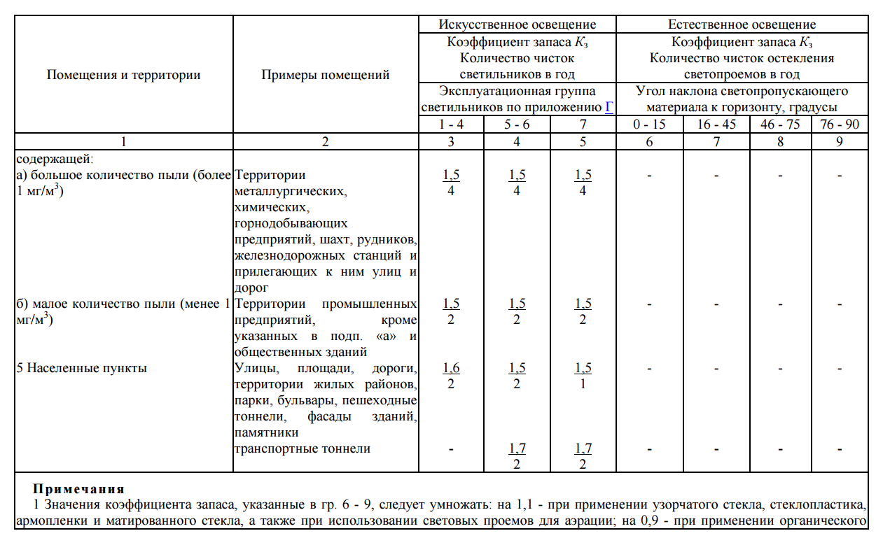 При расчетах коэффициент запаса принимается в пределах 1,5…1, 7. Это нужно так как в процессе эксплуатации теряется прозрачность стекла светового прибора, происходит запыление, снижается яркость лампы, выгорание светодиодов и прочие факторы снижающие световой поток.