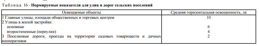 - Средняя горизонтальная освещенность физкультурных и детских площадок на территории микрорайонов должна быть 10 лк.
